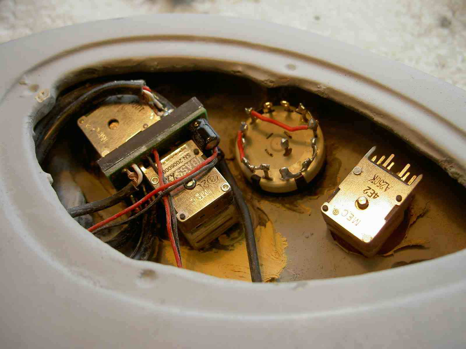 In fact, on the right end of the bridge pickup hole, you're looking right through the instrument because the rear electronics cover is off. |