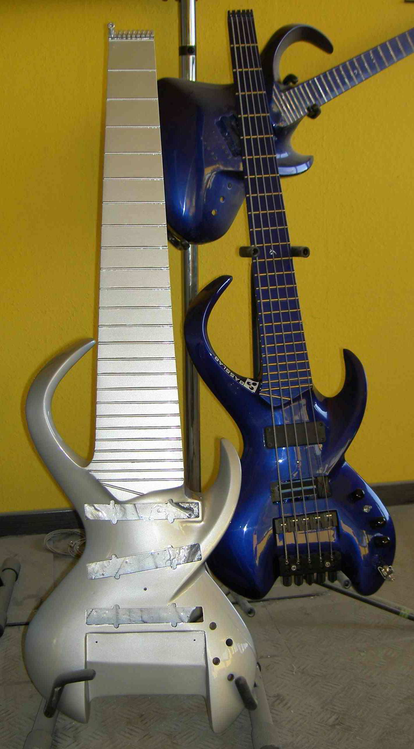 Here the 9-string bass stands in front of a 5-string bass, and you can see that the bodies are the same size.