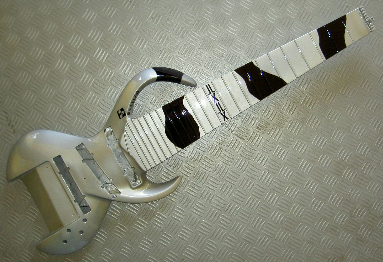The body of the 9-string was altered in an interesting way to make room for the bridge and tuners.