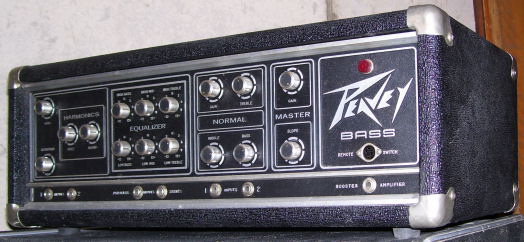 For sale: Peavey Series 400 version B "Bass Power Pak" bass ampsn:7A-025179, built ????210W into 2Ohms. Quite loud enough to match a Marshall Stack and big drum kit (the one on this page). Two distinct channels, one with distortion/fuzz/harmonics and one clean. Each channel has hi and lo inputs, and there are two more inputs that combine these channels in series or parallel. This one has a Slope control (a kind of tone) below the Master - an indicator that it is version B of the amp. Very flexible, I was able to get a Geddy Lee tone out of it, even with the mellow Les Paul Signature bass! With remote footswitch, which I acquired later and never used. Price: $600 |