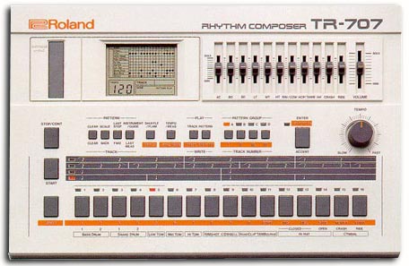 For sale: Roland TR-707 drum machinesn:547837, built 1985?Roland's first all-digital drum machine, with 8-bit and 6-bit (cymbals) samples. 15 sounds: kick 1, kick 2, snare 1, snare 2, low tom, mid tom, high tom, rim-shot, cow bell, hand clap, tambourine, open and closed high-hat, crash/ride cymbals. You can re-map the sounds to different MIDI note numbers - something that we now take for granted, but which was radical at the time. MIDI IN/OUT, DIN SYNC IN/OUT, TRIG OUT. I'll soon post a soundfile. Price: $800 |