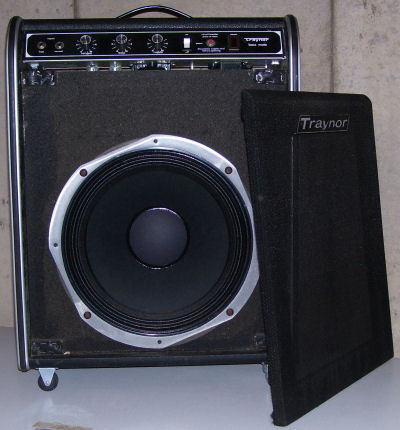 For sale: Yorkville Sound Traynor YBA-2B Bass Matesn:8022780, built 1978-02This bass amp uses a 15" driver and 4 tubes (two each of 12AX7A and 6BQ5). Built-in circuit breaker. Hand-made point-to-point wired, so it can be modded. Schematics may be pasted inside the chassis, but are also available here. The tone has been compared to vintage tube guitar amps, e.g. Jimmy Page. I used it as a bass amp for practicing. The original driver was stated as EIA code 7370, may have been a Marsland, but it was replaced in 2001 with a Peavy Scorpion Plus 15" Kevlar impregnated (rated 200W+). I also added wheels - two fixed, two free wheeling. It's trimmed with chrome & rubber bumper stripping, which was dropped from Traynor production around the year this one was built. Traynor made tube amps up until about 1980 when tube amp production ceased for a couple of decades because solid-state became more popular. Can be used for guitar or bass. Probably needs new a new tube or two, since it has not been used for a number of years. Weighs about 45lbs. Price: $450 From "Yorkville Sound History - 1963 to 1991" by Mike Holman: 1969: Pete Traynor had his hands full in the latter half of 1969 [doing concert sound], so it comes as no surprise that new consumer products were a tad sparse. However a few were developed including the YBA-2B Bass Mate (25 Watts sine-wave rms @ 8 Ohms), a slimmed-down, closed-back replacement for the cube-shaped YBA-2 with 5 Watts more power and with controls - volume, bass & treble - located on the front rather than at the back. |